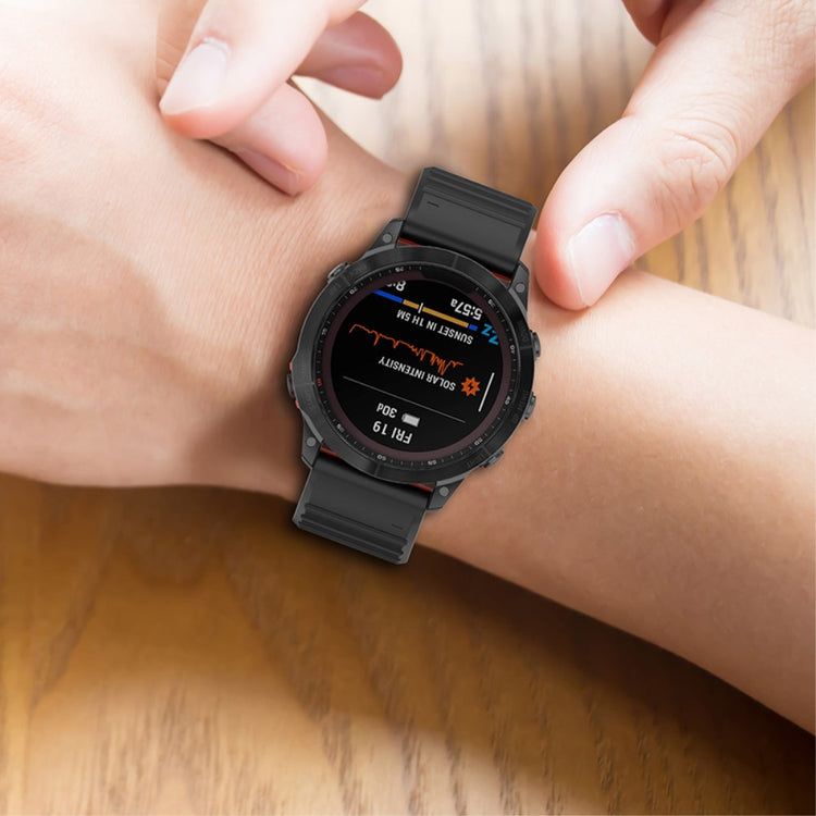 Erstatningsrem til smartklokker laget av miljøvennlig silikon, som er vanntett og svettebestandig, samt motstandsdyktig mot slitasje. Det justerbare designet gir en myk og komfortabel passform, mens den enkle stilen passer til enhver anledning. Remmen er kompatibel med flere Garmin-modeller, inkludert Fenix 7X, Fenix 6X og Fenix 5X.