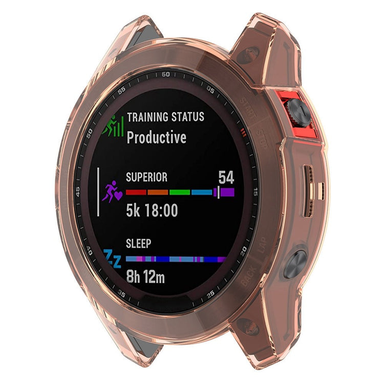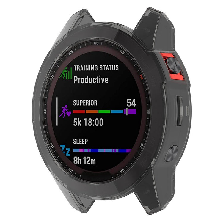 Dette halvåpne, transparente dekselet gir din Garmin Fenix 7/7 Solar/7 Sapphire Solar en stilig beskyttelse uten å gå på kompromiss med funksjonalitet. Laget av mykt og slitesterkt TPU-materiale, beskytter det klokken din mot riper, støt, fett, fingeravtrykk og mer.