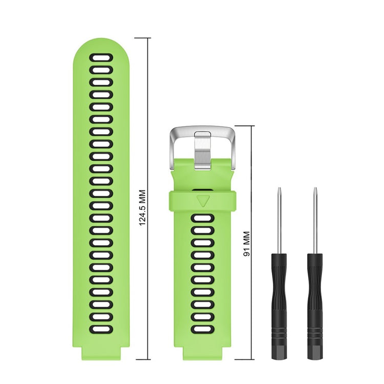 Oppgrader din Garmin-klokke med dette stilige og funksjonelle silikonremmen, laget for å gi deg en forbedret opplevelse. Dette er et ideelt valg for de som ønsker en komfortabel og justerbar løsning. Remmen er laget av mykt og fleksibelt silikonmateriale, designet for å sitte behagelig på håndleddet, uansett om du er på trening eller på jobb. Den har et ergonomisk design som følger håndleddets form, noe som gjør den behagelig å ha på hele dagen. Remmen har også flere hull for enkelt å justere størrelsen, samt en klassisk metallspenne som gjør det raskt å ta den av og på. Bytt enkelt ut din gamle eller ødelagte rem med denne nye remmen for å gi klokken din et friskt og moderne utseende, samtidig som du får en bedre passform. Med en lengde og bredde spesialtilpasset for Garmin Forerunner 735XT, 220, 230, 235, 620 og 630, er dette det perfekte tilbehøret for din klokke.