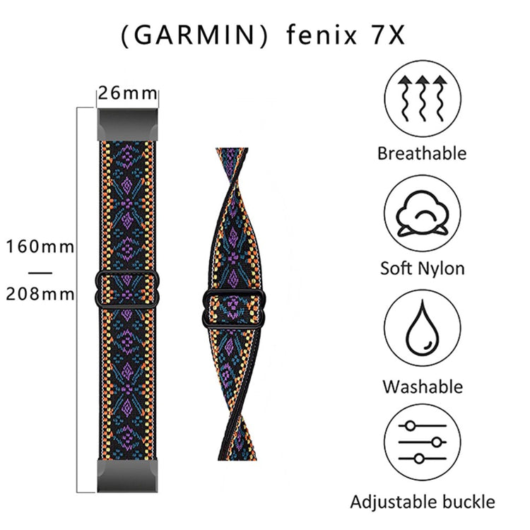 Denne justerbare klokkereimen i elastisk nylon er perfekt for din Garmin Fenix 7S/6S/5S/Instinct 2S. Slitesterk, komfortabel og myk, den er ideell for både kvinner og menn.