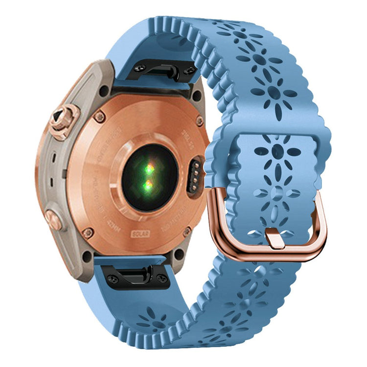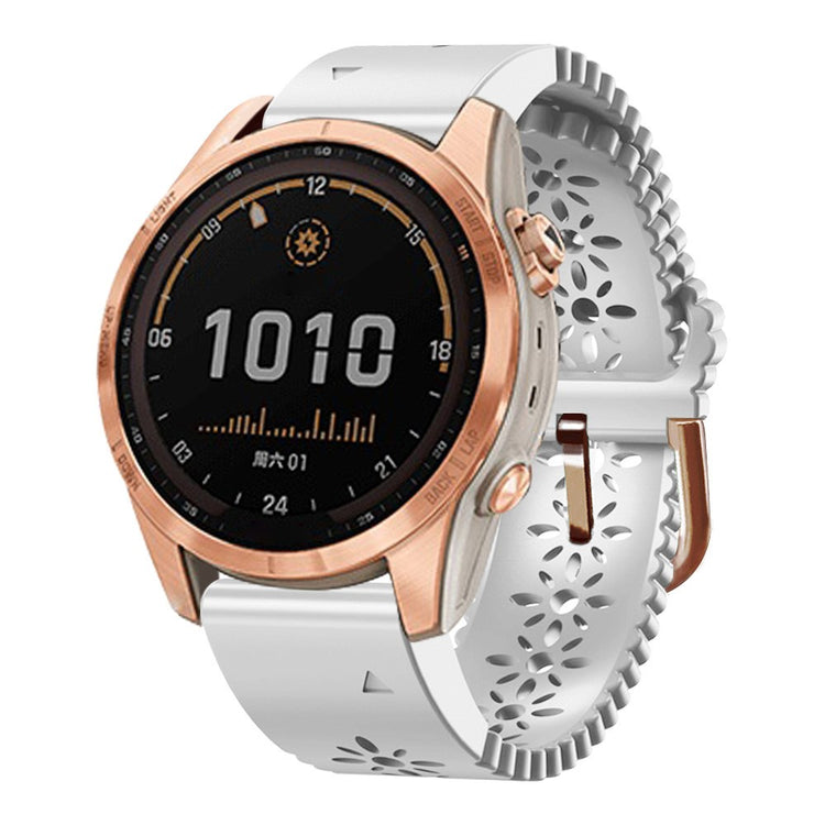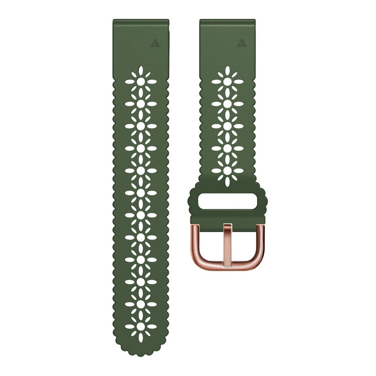 Oppgrader din Garmin-klokke med denne stilige og komfortable silikonreimen. Med et hullet blomstermønster gir denne reimen et unikt preg til klokken din. Laget av miljøvennlig silikon, er den både vanntett og svetteavvisende, og tåler slitasje.