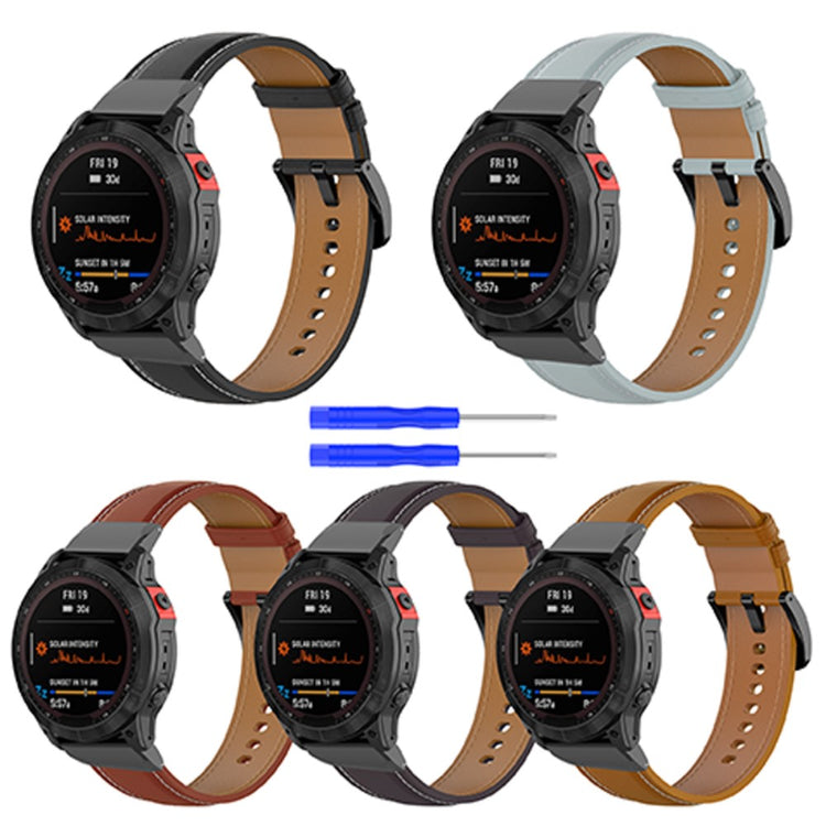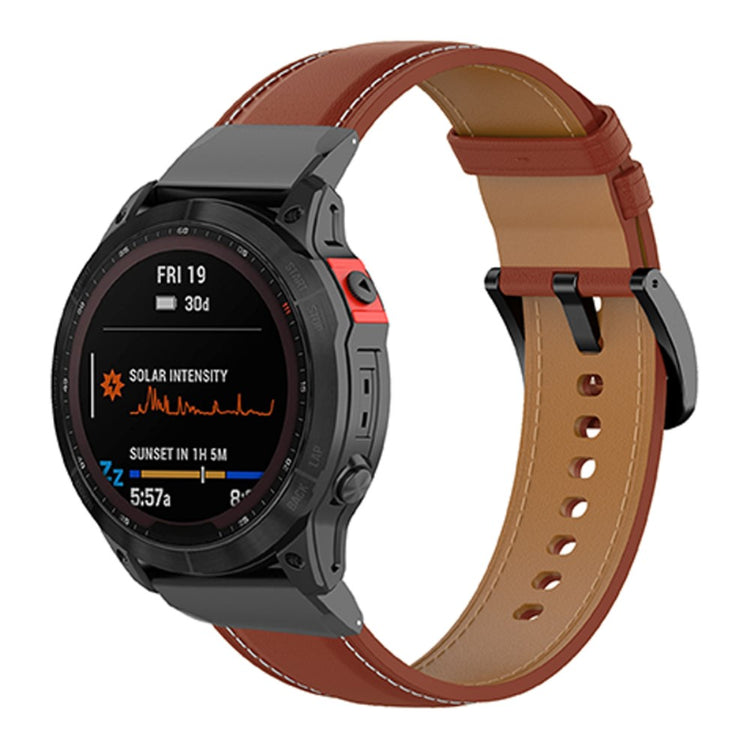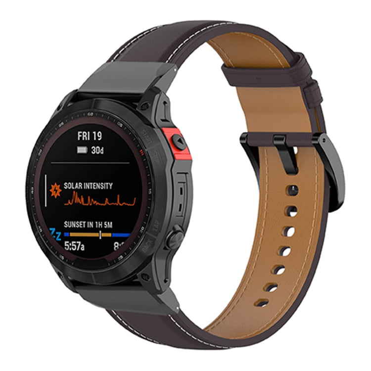 Velg et armbånd som kombinerer stil og komfort med vårt justerbare armbånd i ekte lær for Garmin Fenix 7/6 GPS/5. Laget av ekte lær og med en 316 rustfritt stål tilkobling, gir dette armbåndet en behagelig og myk opplevelse på håndleddet. Den fremragende utførelsen og det solide fargedesignet gjør det både unikt, vakkert og stilig. Armbåndet har en hurtigutløsning som gjør det enkelt å installere og fjerne, og den polerte stålspennen gjør det lett å justere størrelsen for optimal passform. Dette armbåndet er et perfekt alternativ for å forvandle din smartwatch til et stilfullt tilbehør, enten det er til arbeid, fritid eller hverdagsbruk. Med spesifikasjoner som 22 mm bredde og en lengde på 105+132 mm passer det til flere Garmin-modeller, noe som gir deg muligheten til å variere stilen din med letthet.