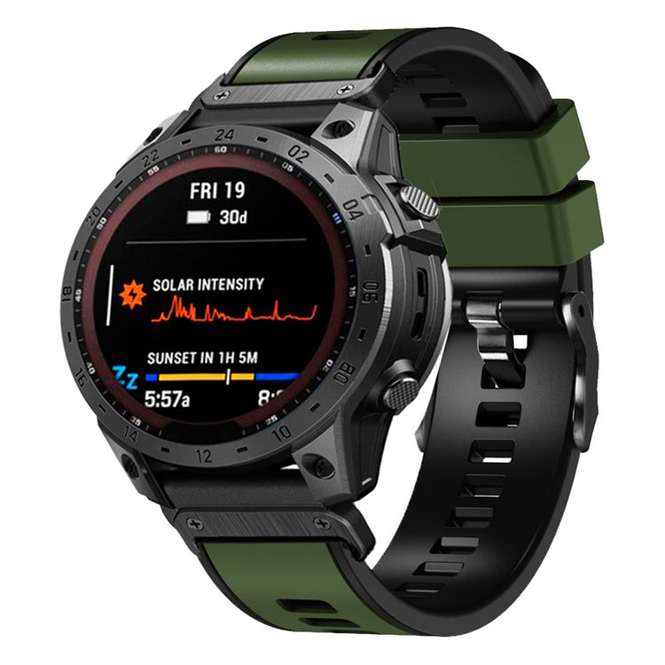 Velg vårt stroppebytte til Garmin Descent G1 / Instinct 2 for en oppgradering av stilen din! Denne quick release silikonklokken er laget av miljøvennlig silikonmateriale, som er både vanntett og sveitsikker, noe som gjør den perfekt for aktive livsstiler. Den slitesterke konstruksjonen sikrer at den tåler slitasje og tear, slik at du kan bruke klokken din uten bekymringer. Det enkle og stilige designet gir et moderne preg samtidig som det passer til enhver anledning. Med en justerbar størrelse er stroppen enkel å tilpasse og gir en myk og behagelig opplevelse på håndleddet. Dette er en ideell erstatning for din gamle eller ødelagte stropp. Vi tilbyr også flere fargealternativer for å møte dine unike stilbehov. Foren kvalitet, komfort og stil med vårt klokkerem! Denne klokken er kompatibel med en rekke modeller, så du kan være trygg på at den passer din Garmin klokke.