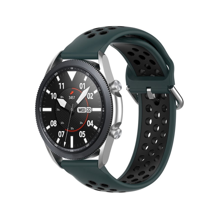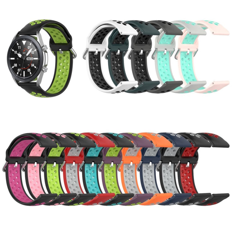 R850 20mm bi-farget silikon klokkerem er laget av mykt silikonmateriale med hull for rask varmeavledning, noe som gir en komfortabel opplevelse. Remmen kan justeres etter individuelle håndleddsomgivelser og er laget av sikker og økologisk materiale som ikke skader kroppen. Denne remmen er kompatibel med Samsung Galaxy Watch 3 41mm og flere andre modeller.