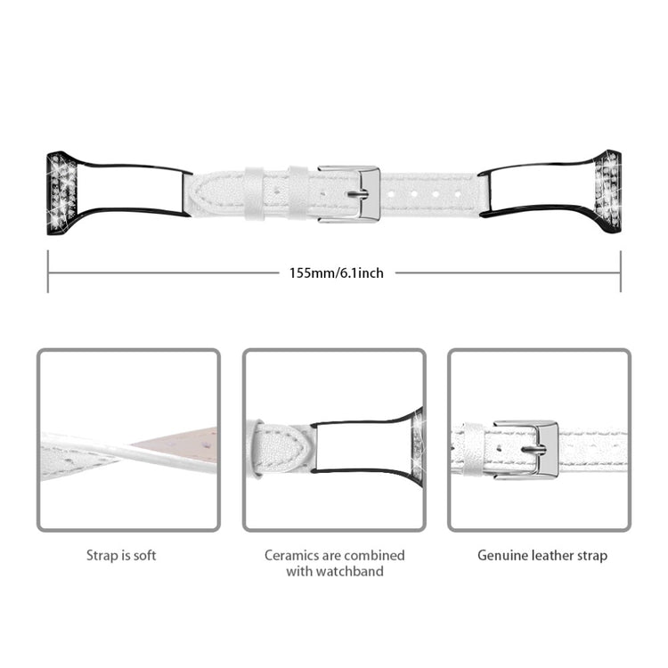 Enten du ønsker å gi ditt smarte klokke et nytt liv, eller bare ønsker å oppgradere stil og komfort, er dette keramikk- og ekte lær armbåndet en utmerket løsning. Laget av førsteklasses okseskinn, sikrer dette armbåndet både holdbarhet og en luksuriøs følelse. Den polerte rustfrie stålspennen gjør det enkelt å justere størrelsen, noe som gir en perfekt passform for håndleddet ditt. Kombinasjonen av keramikkmateriale og dekorative rhinestones gir et unikt og stilig utseende som skiller seg ut fra mengden. Det elegante, myke lærarmbåndet er komfortabelt å ha på seg hele dagen, uansett aktivitet. Det er også en ideell erstatning for et gammelt eller ødelagt armbånd, noe som gjør det lett å installere og fjerne. Med spesifikasjoner som passer håndleddsomkretser fra 5.5 til 8.5 tommer (155mm lengde og 22mm bredde), er dette et allsidig valg for alle som ønsker å kombinere stil med funksjonalitet.