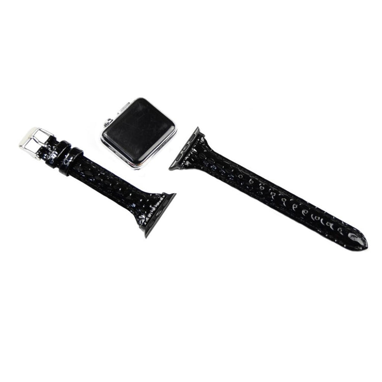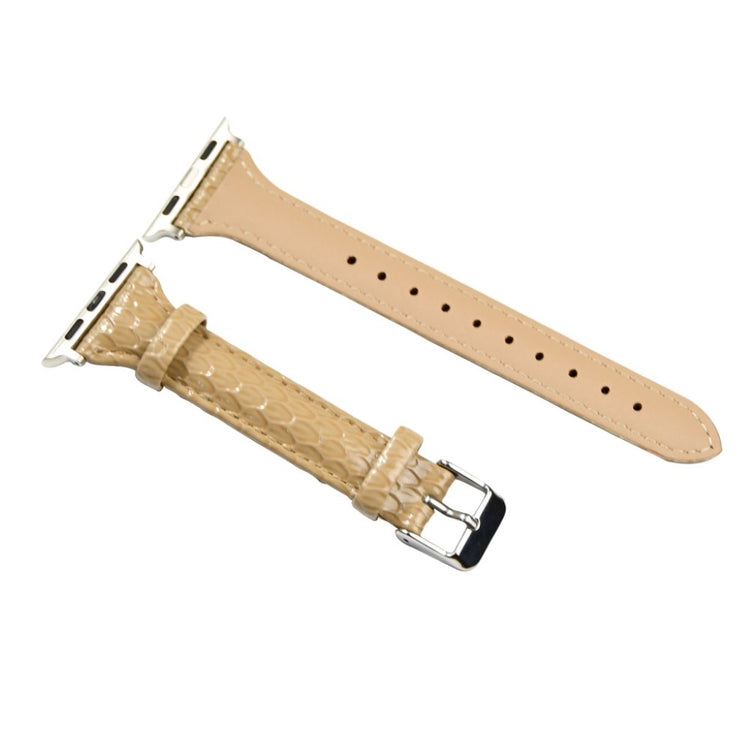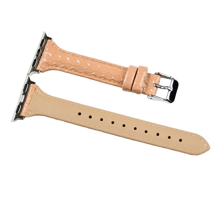 Gi din Apple Watch et stilig nytt utseende med denne justerbare reimen i PU-lær med slangeprint. Reimen er laget av kvalitets PU-lær som er slitesterkt og komfortabelt å bruke. Metallspennen gjør det enkelt å ta klokken av og på, mens hullene i reimen gir deg muligheten til å justere den perfekt til ditt håndledd.