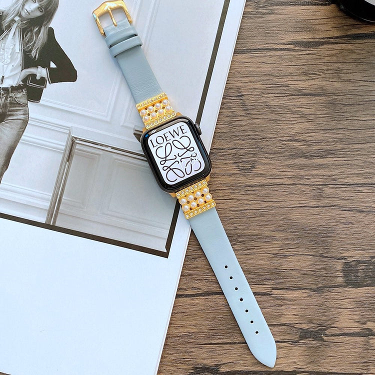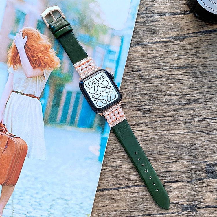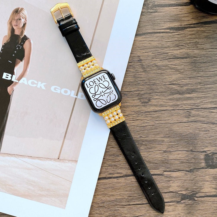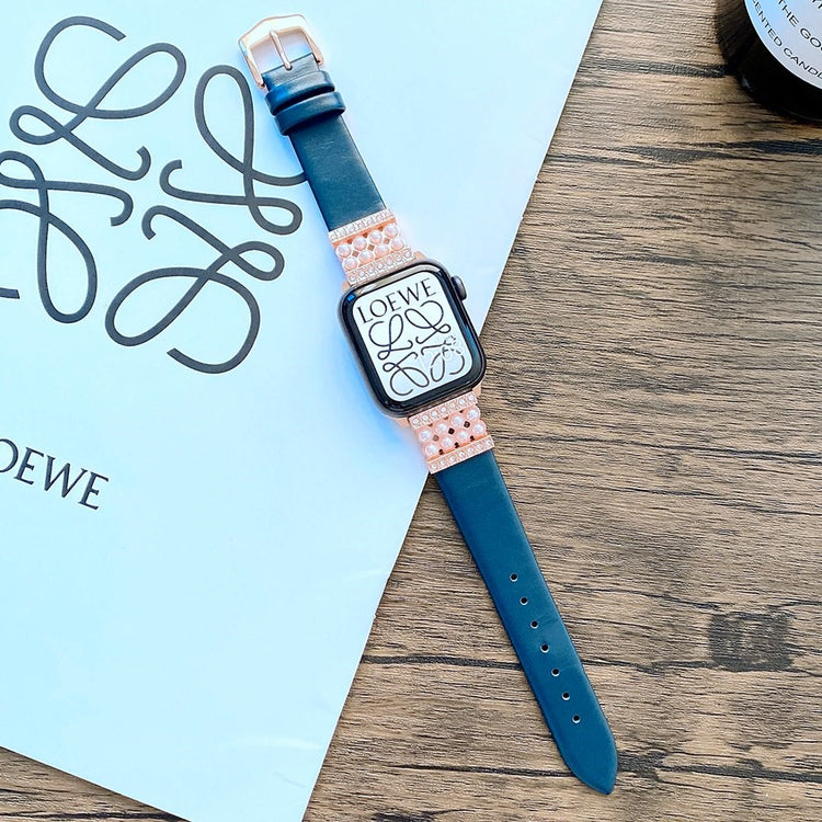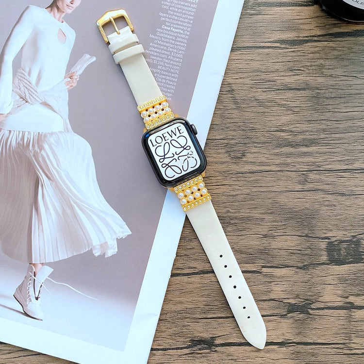 Denne elegante klokkereimen er laget av ekte skinn med dekorative perler og strass-stener, noe som gir en komfortabel og luksuriøs følelse på håndleddet. Metallspennen gjør det enkelt å ta klokken av og på.